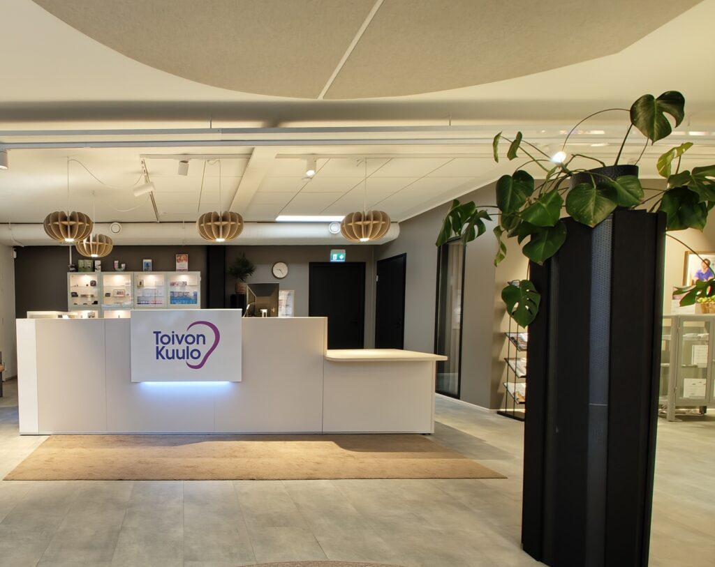 Ilmeen viimeistely ja Toivon Kuulolle luotu oma grafiikka näkyy ulkopuolen teippauksista aina sisätilan akustiikkaelementteihin. Myös henkilökunnan oma taukotila heijastelee tilojen ilmettä ja luo rauhallisen tilan rauhoittua asiakastyön lomassa. Audionomien työhuoneissa akustiikka oli erityisen huomion alla ja tiloissa käytettiinkin määrältään eniten akustisia tuotteita tilan kokoon nähden.