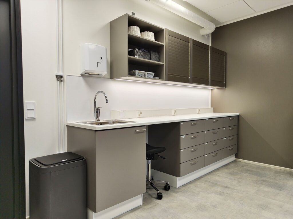 Tilasuunnitelman pohjalta Affe suunnitteli tilaan kalustuksen, jossa huomioitiin erityisesti hyvä huoneakustiikka sekä toimiva ja viihtyisä asiakaskokemus. Akustiikkaa parantamaan sijoiteltiin ääntä vaimentavia tuotteita niin lattialle, seinille, kuin kattoonkin.